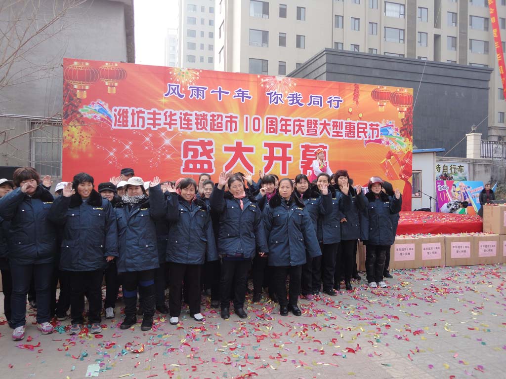 嚴(yán)冬送溫暖,關(guān)愛送報(bào)員。11月23日,在十周年慶暨大型惠民節(jié)開幕儀式上,豐華連鎖超市再次獻(xiàn)愛心,向奔波在市區(qū)的濰坊報(bào)業(yè)集團(tuán)165位報(bào)紙投遞員,贈(zèng)送御寒棉衣,表達(dá)真摯的問候。
