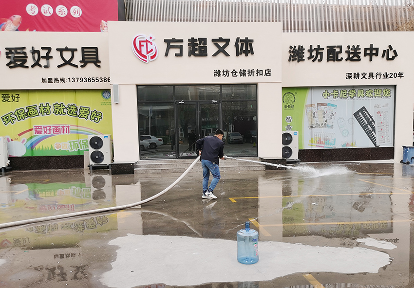3月23日,安保部惠海和趙剛杰利用空暇時間,沖刷停車場裝修塵土,使停車場衛生環境煥然一新。