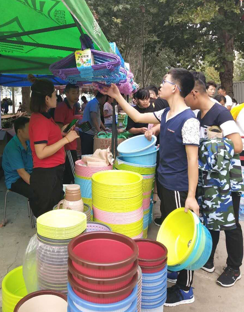 “這兩種暖瓶?jī)?nèi)膽是一樣的,但是外殼的材質(zhì)不同,價(jià)格高的這一款外殼設(shè)計(jì)更個(gè)性一些。您放心,我們超市提供七天退換服務(wù),您可以先試用一下。”……這位耐心又專業(yè)地給新生和家長(zhǎng)介紹商品的員工是信息學(xué)院店戴紅玉。早上六點(diǎn)多她就來(lái)到了店里,忙著收銀、搭建外場(chǎng)、懸掛促銷信息牌,之后又跑進(jìn)跑出,跟其他部門(mén)幫忙的同事介紹商品、價(jià)格、收款注意事項(xiàng)等。到了中午吃飯時(shí)間,顧客逐漸減少了一些,戴紅玉總算稍稍松了一口氣,聊起了開(kāi)學(xué)季的情況。“這是俺店第一次搭建外場(chǎng),沒(méi)想到外場(chǎng)的銷售還挺好,之前的辛苦沒(méi)白費(fèi)。”